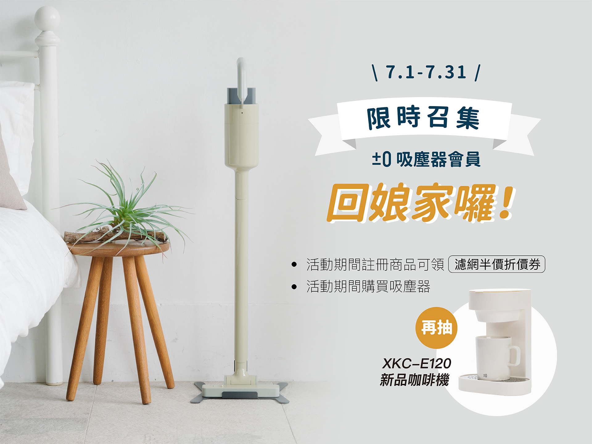 活動期間購買±0任一型號吸塵器,於2021/07/31前至正負零官網完成商品註冊,並上傳購買憑證,經正負零官網審查後符合資格者,即有機會獲得±0新品XKC-E120咖啡機。