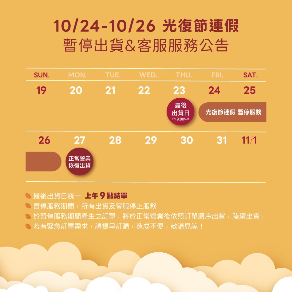 10/24-10/26光復節連假期間,將暫停出貨